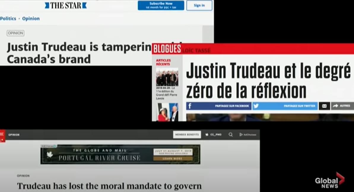 Ce que ne montre pas la vidéo, ce sont les secondes qui suivent, visibles dans la vidéo ci-dessous, lors desquelles Justin Trudeau fait défiler sur grand écran les "gros titres extraordinaires" auxquels il fait ironiquement référence : plusieurs titres franchement critiques à son encontre d'une partie de la presse canadienne, comme "Justin Trudeau et le degré zéro de la réflexion" ou encore "Trudeau a perdu le droit moral de gouverner".