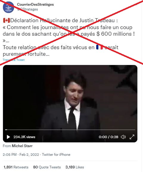 "Déclaration hallucinante de Justin Trudeau" : depuis début février, une vidéo partagée plusieurs milliers de fois sur Twitter montre le premier ministre canadien déclarant avoir payé les médias canadiens "600 millions de dollars" pour être "tranquille" et éviter toute critique dans les médias.