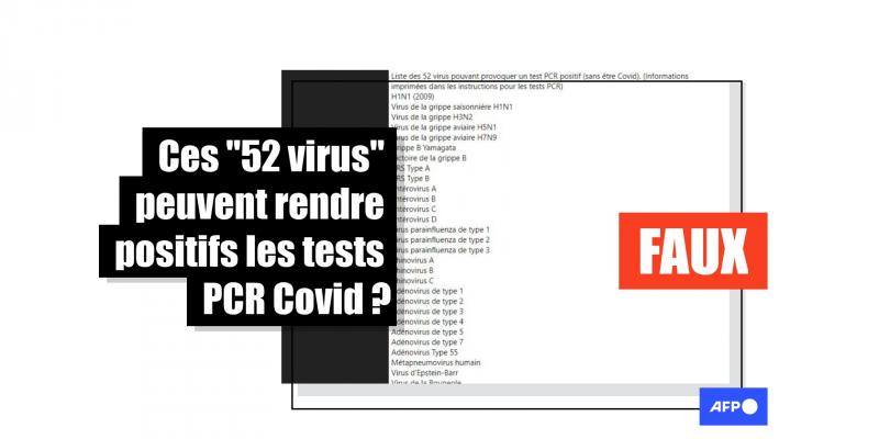 En janvier, des internautes français et belges ont partagé une liste de "52 virus" en affirmant qu'ils rendaient positifs les tests PCR destinés à détecter le virus responsable du Covid-19. C'est faux, ont expliqué plusieurs médecins à l'AFP: les tests PCR pratiqués actuellement détectent bien spécifiquement le Sars-Cov-2. De plus, si certaines notices de test contiennent une liste similaire à celle partagée par les internautes, c'est justement pour démontrer que les tests PCR ne détectent pas ces agents pathogènes.