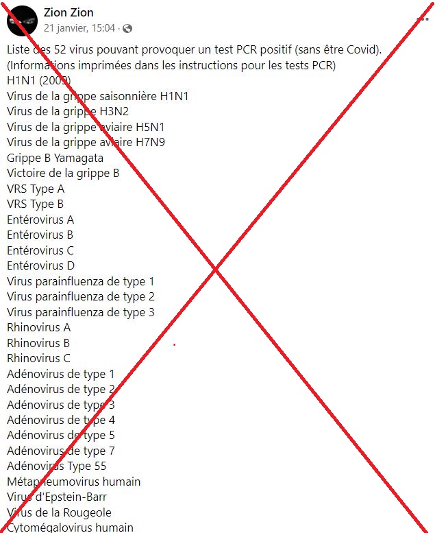 Il s'agit de la "liste des 52 virus pouvant provoquer un test PCR positif (sans être Covid)", affirment des internautes qui énumèrent plusieurs agents pathogènes (virus de la grippe, adénovirus, entérovirus...) qui seraient détectés par les tests PCR destinés au coronavirus et fausseraient donc le résultat de ces derniers.