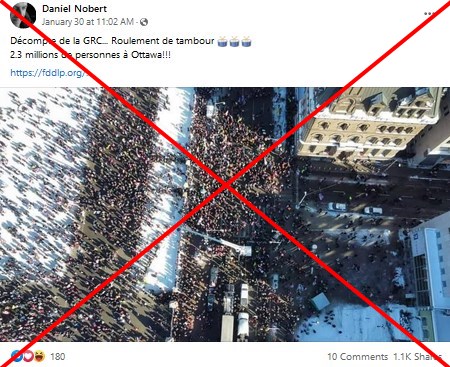 "Décompte de la GRC... 2.3 millions de personnes à Ottawa!!!", s'exclame une publication datée du 30 janvier et partagée plus de 1.100 fois sur Facebook.