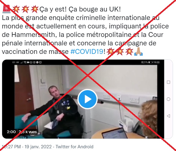 "La plus grande enquête criminelle internationale au monde est actuellement en cours", au sujet de "la campagne de vaccination de masse", et elle impliquerait "la police métropolitaine" londonienne ainsi que "la Cour pénale internationale", prétendent plusieurs publications partagées à des centaines voire des milliers de reprises sur Twitter (1, 2, 3), Facebook (1, 2) et Telegram depuis fin janvier.