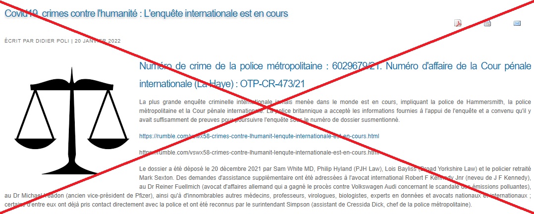 Les publications citent des numéros de référence, censés prouver l'ouverture des enquêtes. Pour la police métropolitaine, il s'agit du "numéro de crime" 6029679/21 et pour la Cour pénale internationale, du "numéro d'affaire" OTP-CR-473/21.