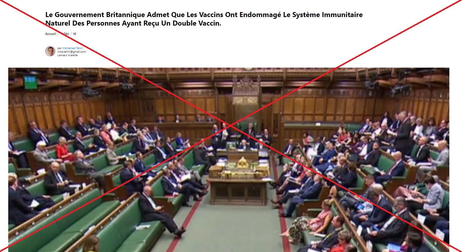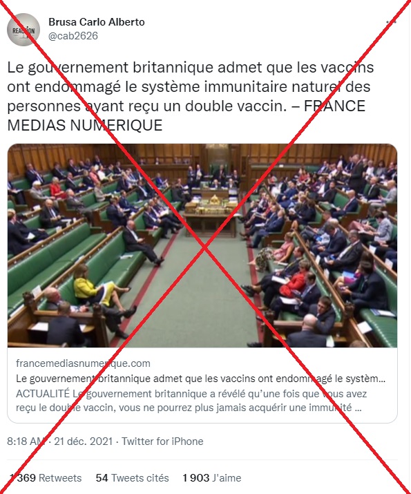 "Le Gouvernement Britannique Admet Que Les Vaccins Ont Endommagé Le Système Immunitaire Naturel Des Personnes Ayant Reçu Un Double Vaccin", prétend un article publié fin décembre 2021 et partagé près de 25.000 fois sur Facebook depuis, selon l'outil de mesure d'audience sur les réseaux sociaux Crowdtangle.