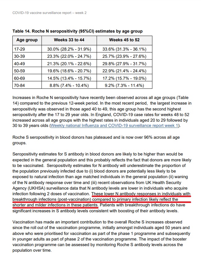 Si une telle explication n'apparaît pas dans le rapport du 21 octobre 2021, elle a par ailleurs été ajoutée par l'UKHSA dans les rapports ultérieurs sur la surveillance des vaccins. On peut y lire que "ces taux d'anticorps N plus faibles chez les personnes ayant une 'percée d'infection' (une infection après la vaccination) que ceux des personnes ayant une première infection signifient probablement que les infections sont plus courtes et plus légères chez ces patients (qui sont vaccinés)".