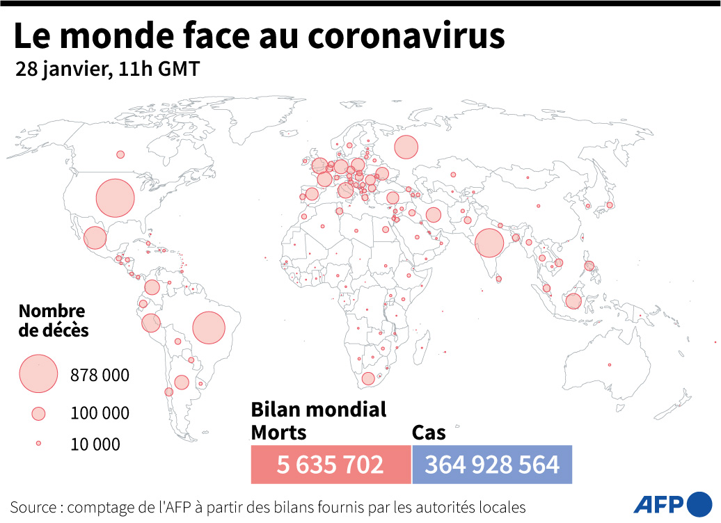 La pandémie de Covid-19 a fait au moins 5,63 millions de morts dans le monde depuis fin décembre 2019, selon un bilan établi par l'AFP à partir de sources officielles, arrêté au 28 janvier 2022.