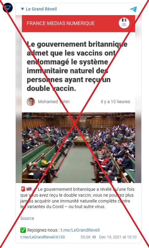 "Le gouvernement britannique a révélé qu'une fois que vous avez reçu le double vaccin, vous ne pourrez plus jamais acquérir une immunité naturelle complète contre les variantes du Covid – ou tout autre virus", s'alarment encore d'autres internautes dans des publications (1, 2) totalisant plus de 100.000 vues sur Telegram, et d'autres plusieurs milliers de partages sur Twitter (1, 2, 3).