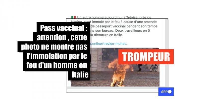 Leur colère s'est concentrée ces derniers jours autour d'une photo, relayée sur Facebook et Twitter et présentée comme l'immolation par le feu d'un homme dans la province italienne de Trévise, désespéré après s'être vu infliger une amende pour "défaut de passeport vaccinal pendant son temps de travail dans son bureau".