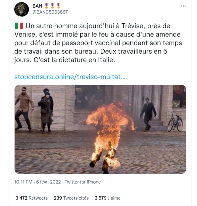 "Dictature en Italie : le pass vaccinal fait des ravages...amendes et toutes sortes d'interdictions pour les non-vaccinés ! Pour certains, la vie n'a plus de sens!!", peut-on lire sur une publication Facebook datée du 7 février, renvoyant vers un article du site Planetes360 . "Un autre homme aujourd'hui à Trévise, près de Venise, s'est immolé par le feu à cause d'une amende pour défaut de passeport vaccinal pendant son temps de travail dans son bureau. Deux travailleurs en 5 jours. C'est la dictature en Italie", abonde une autre publication relayée plusieurs milliers de fois sur Twitter.