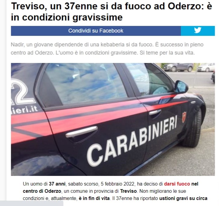 La photographie est également relayée sur le site internet italien StopCensura qui précise que la scène s'est passée le samedi 5 février à Oderzo. Peu avant 19h, un employé d'un kebab s'est immolé par le feu dans la rue, s'aspergeant le corps d'une bouteille remplie d'essence, selon le site internet. "L'homme, la trentaine, n'avait pas de Pass Vert. Pour cette raison, les carabiniers, après un premier contrôle hier soir, vendredi 4 février, l'ont sanctionné ", peut-on lire. "Il est désormais hospitalisé dans un état grave mais pas en danger de mort."