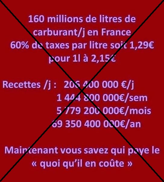 Selon ces internautes, l'Etat toucherait ainsi 70 milliards d'euros par an grâce à la vente de carburant. Les consommateurs verraient en effet passer 60% de leur plein d'essence en taxes qui atterriraient directement dans les caisses de l'Etat - "soit 1,29€ pour 1 litre à 2,15€". Multiplié par les 160 millions de litres qui seraient vendus chaque jour en France, cela représenterait près de 70 milliards d'euros, affirme un visuel repris par plusieurs publications.
