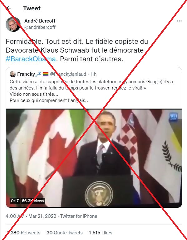 "Cette vidéo a été supprimée de toutes les plateformes (y compris Google) il y a des années. Il m'a fallu du temps pour le trouver. rendez-le viral ! (sic)", peut-on lire dans le tweet qui diffuse l'extrait trompeur. La séquence a rapidement été relayée par le présentateur de Sud Radio André Bercoff qui y a vu une preuve que Barack Obama partage le même point de vue que Klaus Schwaab, fondateur et président exécutif du Forum économique mondial (WEF) de Davos, régulièrement accusé par la sphère complotiste de vouloir "soumettre l'humanité".