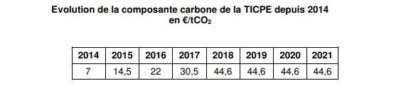 La TICPE est la plus importante et représente à elle seule 40% du coût du carburant à la pompe. Depuis 2014, elle intègre une "composante carbone", qui doit financer la transition énergétique et devait augmenter progressivement chaque année jusqu'en 2022.