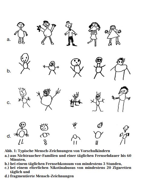 La légende de celle-ci explique qu'il s'agit de dessins "typiques" d'enfants, classés selon les critères suivants : la première ligne (a.) montre des productions d'enfants "de familles non-fumeuses regardant jusqu'à une heure de télévision quotidienne", la deuxième (b.) des enfants "avec une consommation quotidienne de télévision d'au moins 3 heures", la troisième des enfants (c.) "dont les parents ont une consommation de nicotine d'au moins 20 cigarettes par jour", et la quatrième montre (d.) "des dessins de bonshommes fragmentés".