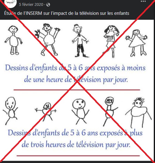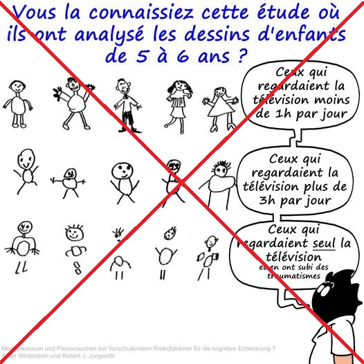Un visuel tiré d'une étude circulant depuis des années sur Internet démontrerait l'impact de la TV sur la capacité des enfants à dessiner des bonshommes. Cette image, souvent incorrectement sourcée et reproduite, provient de travaux d'observation d'un praticien allemand présentant plusieurs biais méthodologiques, réalisée il y a une quinzaine d'années et réutilisée pour son côté spectaculaire. Pour l'heure, cette étude n'a pas été reproduite telle quelle selon plusieurs experts travaillant sur ce sujet. Tous appellent à la "vigilance" face aux "usages problématiques des écrans", notant toutefois que des usages raisonnés de ceux-ci peuvent être envisagés, voire souhaités.