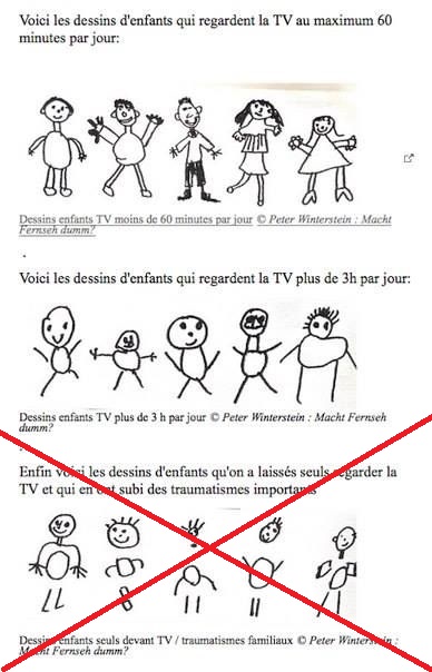 L'image fait le tour des réseaux sociaux : on y voit plusieurs rangées de bonshommes crayonnés, les plus détaillés en haut, et les plus grossièrement esquissés en bas. Les quelques mots de légende expliquent que les personnages du haut ont été tracés par des enfants regardant peu ou pas la télévision, tandis que ceux qui semblent désarticulés et dont les bras et les jambes sont des simples traits proviendraient d'enfants regardant la télévision seuls, plus de trois heures par jour.