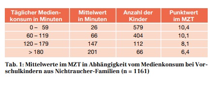 Selon les résultats de ces recherches, les enfants ayant passé moins d'une heure devant la télévision décrochent une moyenne de 10,4 points pour leurs dessins, ceux qui regardent entre une et deux heure de télévision par jour reçoivent 10,1 points en moyenne, les enfants passant entre deux et trois heures récoltent 8,1 points et ceux qui regardent la télévision plus de 3 heures par jour ont une moyenne de 6,4.