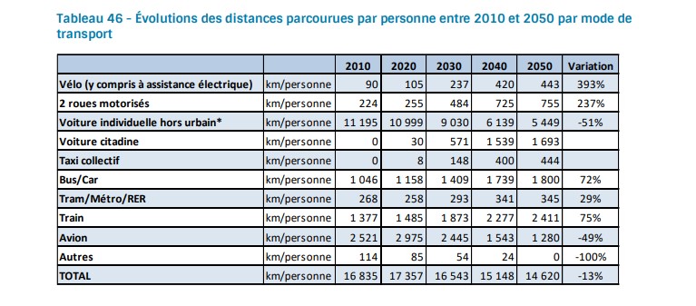On ne trouve pas non plus trace de ce chiffre dans le scénario 2017 : le seul pourcentage proche d'une telle affirmation projette une baisse de "-51%" des km parcourus par personne en "voitures individuelles hors urbain" (p. 33 des "hypothèses et résultats").
