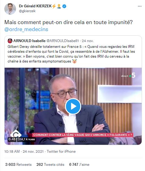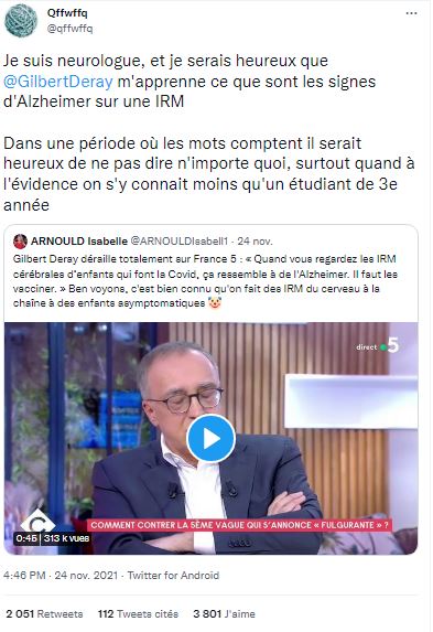 "Quand vous regardez les IRM cérébrales de gosses qui font la Covid, ça ressemble à de l'Alzheimer. Moi, je n'ai pas envie que des gosses de 5-11 ans aient des images qui ressemblent à de l’Alzheimer, ça c'est très clair. [...] Je pense qu'il faut les vacciner", lançait Gilbert Deray, l'un des invités de l'émission "C à vous" diffusée sur France 5 le 23 novembre 2021.