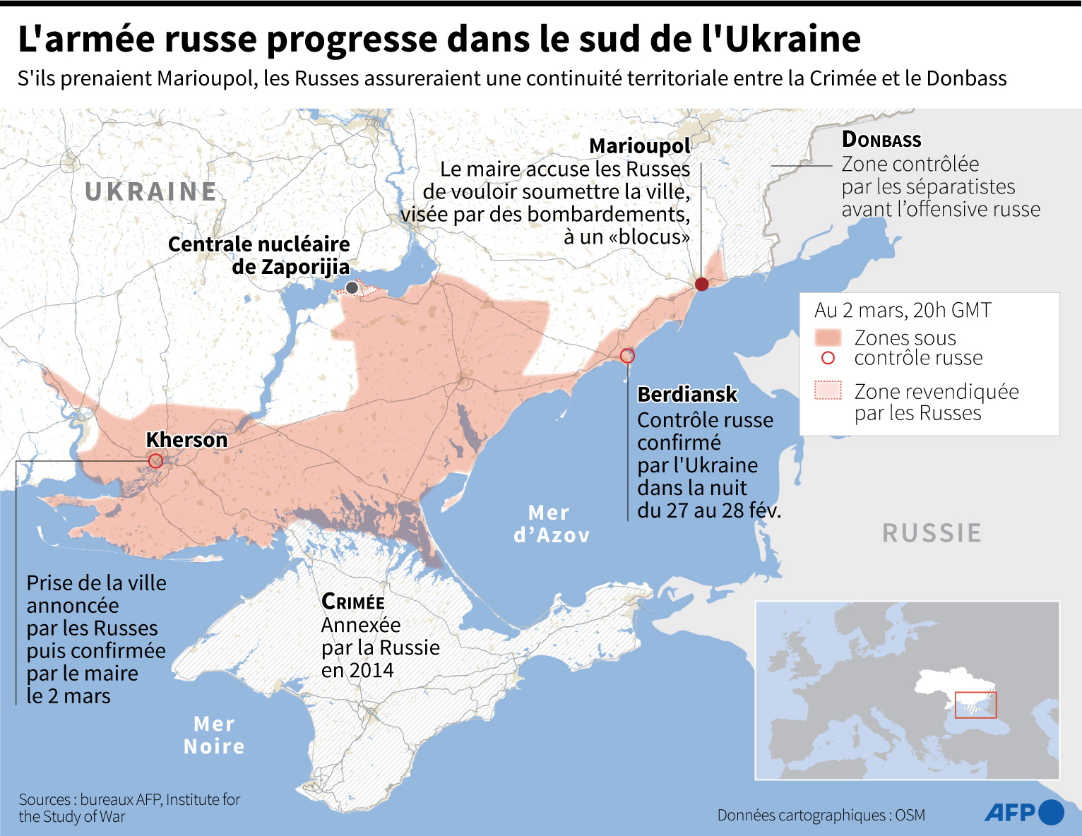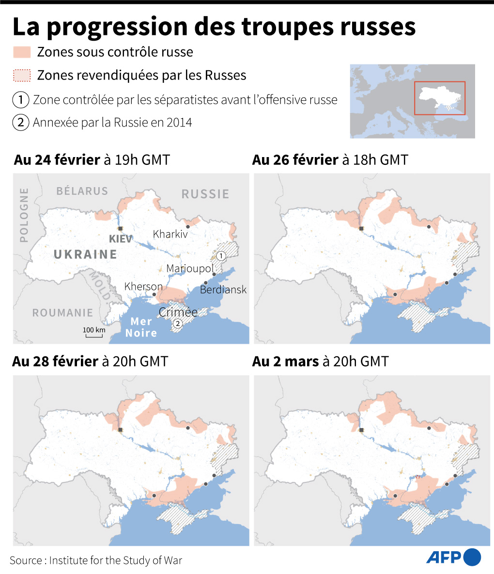 Le 3 mars 2022, le président russe Vladimir Poutine s'est déclaré déterminé à poursuivre l'offensive contre l'Ukraine "sans compromis", alors que les forces russes pilonnaient plusieurs villes stratégiques. Le gouverneur de la ville de Tcherniguiv, au nord de l'Ukraine, a notamment fait part de neuf morts et quatre blessés dans des bombardements visant deux écoles et des habitations de la ville en fin d'après-midi, l'un des derniers témoignages de ces frappes meurtrières.