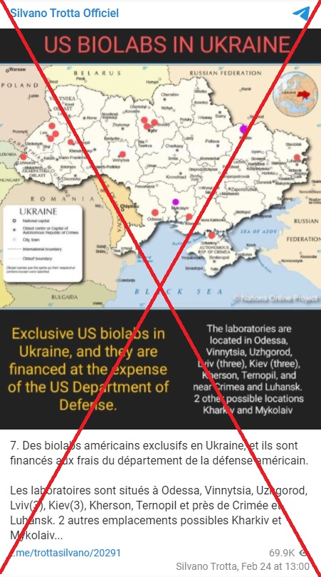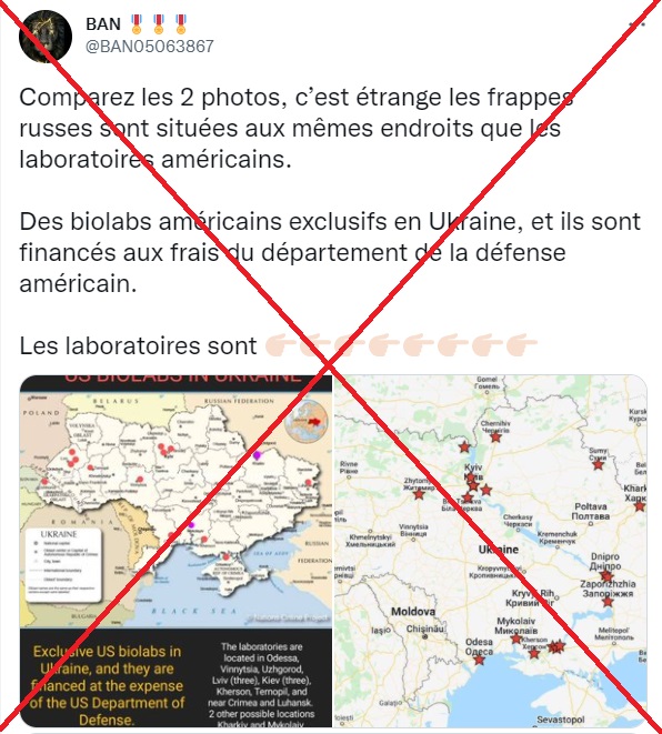 "Des biolabs américains exclusifs en Ukraine (...) financés aux frais du département de la défense américain" auraient fait partie des premières cibles des bombardements russes, affirme un tweet publié le 24 février et partagé un peu plus d'une centaine de fois depuis, partageant des cartes censées représenter la position de ces laboratoires et des bombardements.