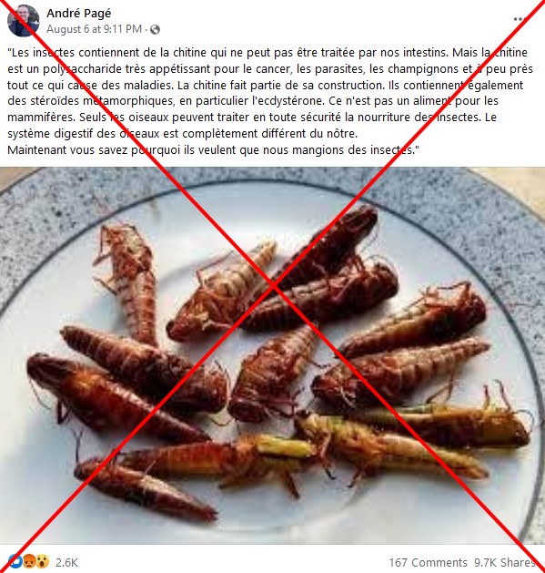 "Les insectes contiennent de la chitine qui ne peut pas être traitée par nos intestins," peut-on lire sur une publication Facebook datée du 8 août 2022 et partagée plus de 9.700 fois.