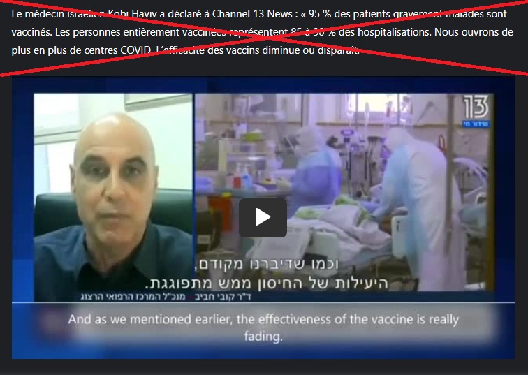 Les articles poursuivent en affirmant citer "le médecin israélien Kobi Haviv", qui aurait "déclaré à Channel 13 News" que "95 % des patients gravement malades sont vaccinés. Les personnes entièrement vaccinées représentent 85 à 90 % des hospitalisations. Nous ouvrons de plus en plus de centres COVID. L'efficacité des vaccins diminue ou disparaît".