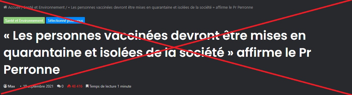 Les personnes non-vaccinées seraient moins "dangereuses" que les vaccinées qui devraient être placées en "quarantaine", avancent plusieurs articles partagés des milliers de fois ces dernières semaines, citant une interview de Christian Perronne et prétendant s'appuyer sur les affirmations d'un médecin israélien. C'est infondé, et va à l'encontre des données scientifiques connues à ce jour, selon les spécialistes interrogés par l'AFP. En outre, les citations du médecin israélien utilisées dans l'article sont des extraits trompeurs d'une interview dans laquelle il se prononce en faveur de l'injection d'une troisième dose de vaccin dans son pays.