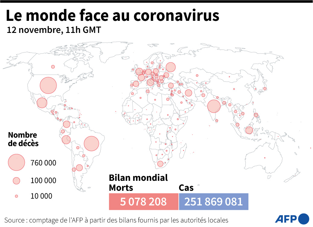 Au 12 novembre 2021, la pandémie a fait au moins cinq millions de morts dans le monde depuis que le bureau de l'OMS en Chine a fait état de l'apparition de la maladie fin décembre 2019, selon un bilan établi par l'AFP à partir de sources officielles.