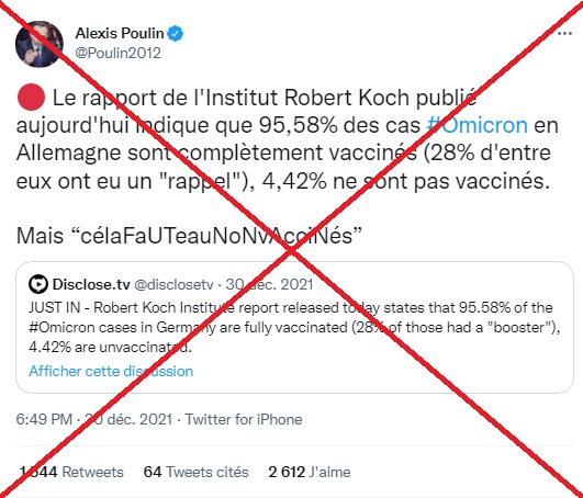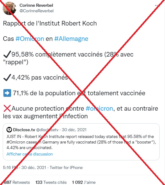 "Le rapport de l'Institut Robert Koch publié aujourd'hui indique que 95,58% des cas #Omicron en Allemagne sont complètement vaccinés", indique l'éditorialiste de RT France Alexis Poulain dans un post Twitter daté du 30 décembre partagé plus de 1.500 fois. D'autres publications en concluent que les vaccins n'assurent "aucune protection contre omicron et au contraire les vax augmentent l'infection".