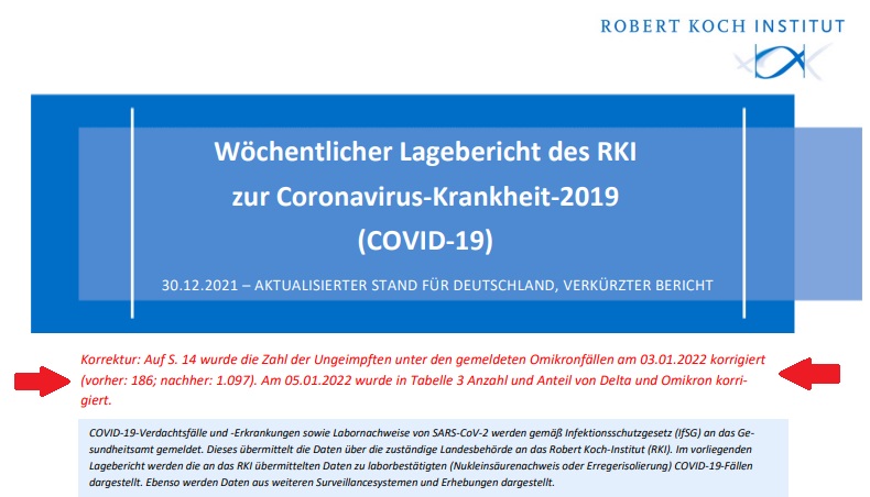 Le rapport du 30 décembre 2021 aborde notamment la présence du variant Omicron en Allemagne. En le consultant le 12 janvier, on remarque dès la première page que le rapport mentionne une correction dans ses chiffres, réalisée le 3 janvier 2022. Il est cependant possible de retrouver la version initiale du rapport archivée en ligne.