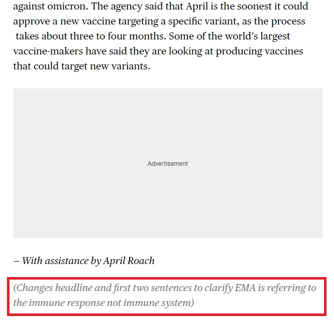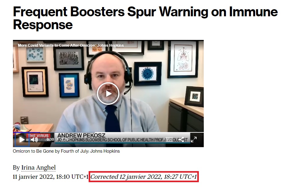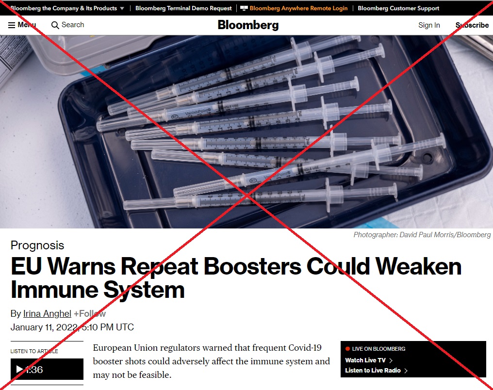 Une dépêche de l'agence Bloomberg, d'abord incorrectement titrée "L'UE met en garde contre le risque d'affaiblissement du système immunitaire en cas d'administration de doses de rappel" a vraisemblablement suscité la confusion. Elle a depuis été corrigée, mais des versions archivées montrant son premier titre sont toujours consultables en ligne. Ci-dessous une comparaison du premier titre de Bloomberg, et du titre modifié, au 18 janvier.