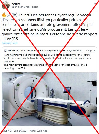 "J'avertis les personnes ayant reçu le vaccin d'éviter les scanners IRM, en particulier pdt les 1res semaines, car certains ont été gravement affectés par l'électromagnétisme qu'ils produisent. Les cas les+ graves ont entraîné la mort", peut-on lire dans un tweet daté du 24 septembre dont la capture d'écran a été reprise dans de nombreuses publications sur Facebook. Il s'agit de la traduction d'un tweet (en anglais) daté du 22 septembre publié par un utilisateur se présentant comme un docteur.