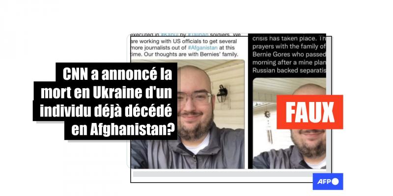 Ces deux tweets, faussement attribués au média américain CNN, montrent chacun la photographie du même homme. Le premier prétend qu'il s'agit du "journaliste de CNN Bernie Gores" qui a été "exécuté à Kaboul par des soldats Talibans" quand le second assure que cet homme est un activiste américain tué par "une mine posée par les séparatistes soutenus par la Russie".