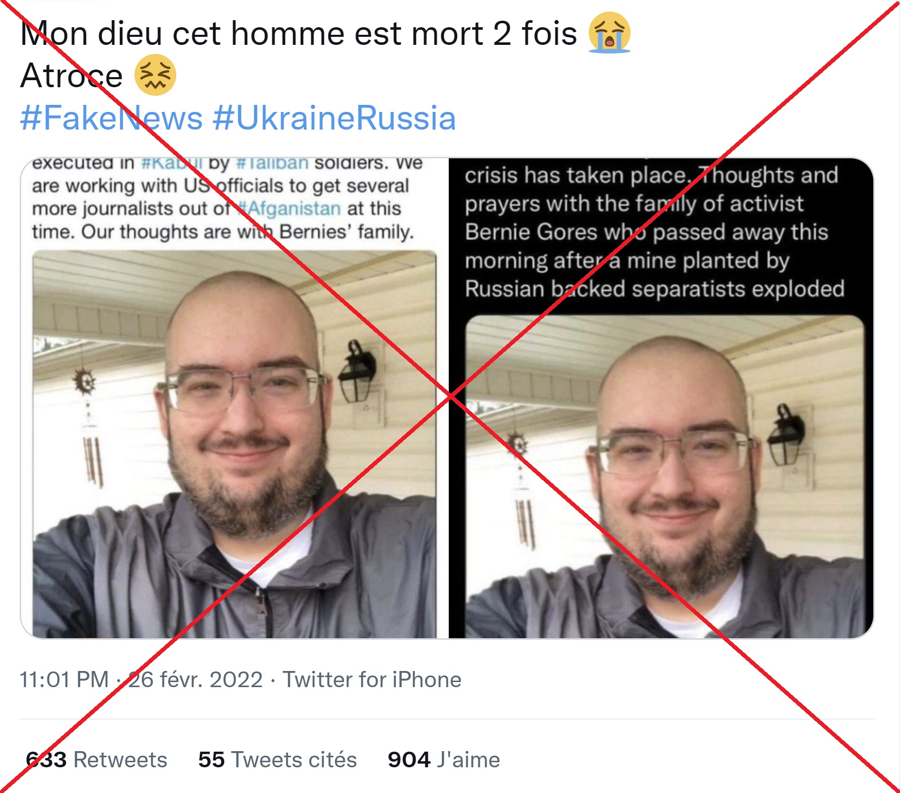 "Mon dieu cet homme est mort 2 fois", "Atroce", s'insurge un internaute criant à la "fake news", dans une publication partagée plus de 600 fois sur Twitter depuis le 26 février 2022.
