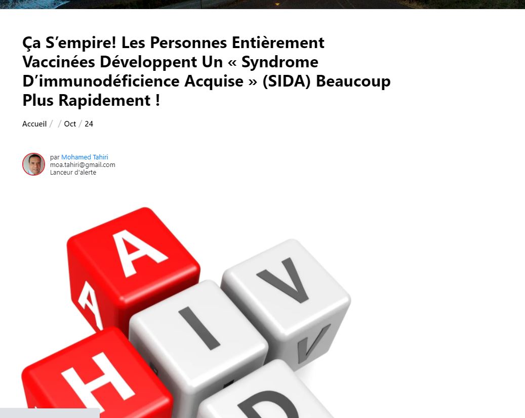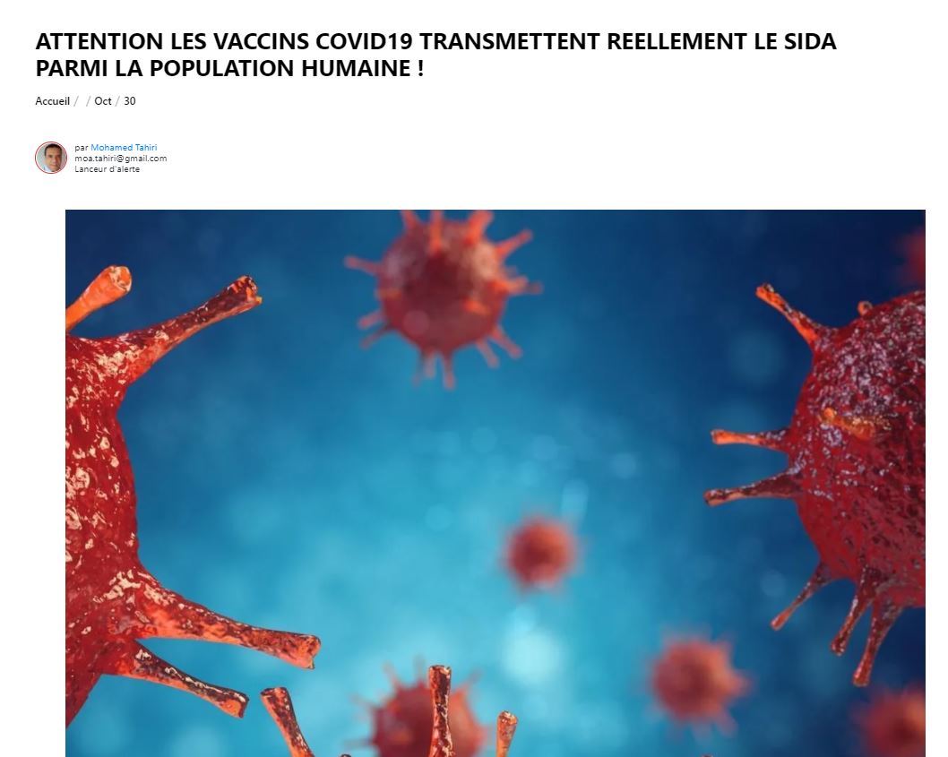 Les 24 et 30 octobre dernier, le site France médias numérique, déjà épinglé à plusieurs reprises par l'AFP pour avoir diffusé de fausses informations, s'appuyait ainsi sur les rapports britanniques pour publier deux articles titrés "Les personnes entièrement vaccinées développent un syndrome d'immunodéficience acquise beaucoup plus rapidement" et "Attention, les vaccins Covid-19 transmettent réellement le sida parmi la population humaine".