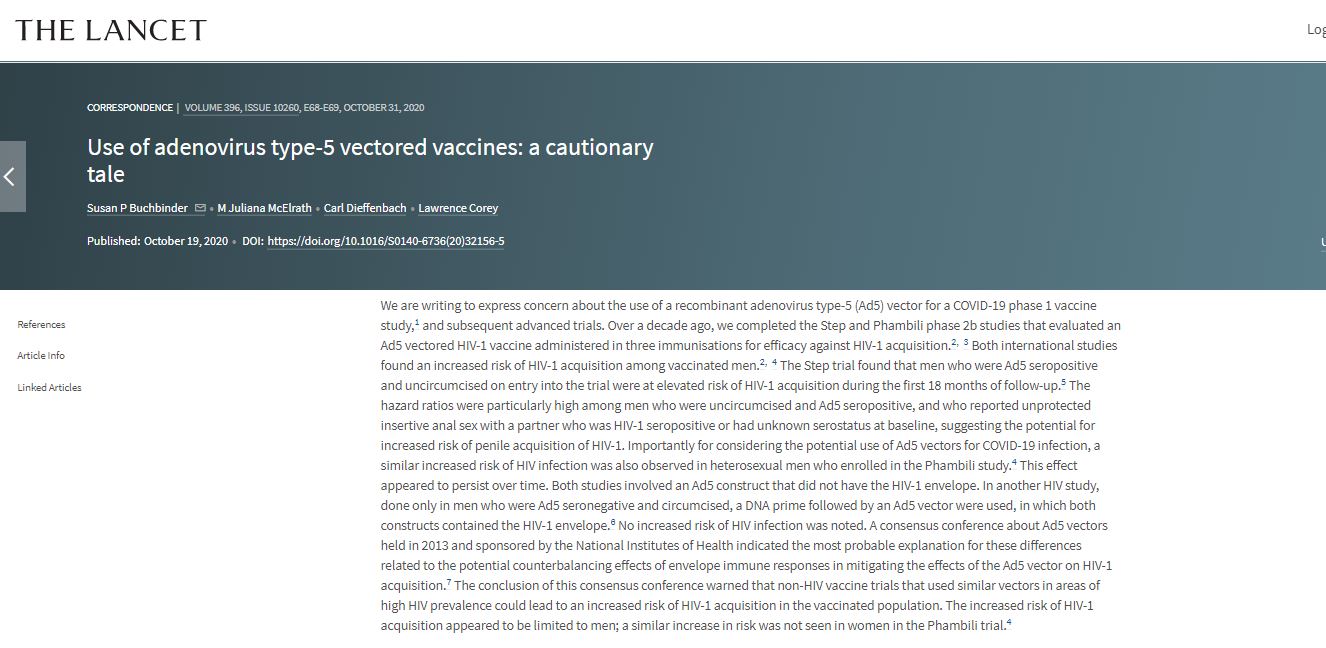 Dans ce courrier, quatre scientifiques se sont inquiétés du fait que certains vaccins contre le Covid-19 utilisent, afin de provoquer une réponse immunitaire contre le Sars-CoV-2, une méthode pouvant augmenter les risques d'infection au Virus de l'Immunodéficience Humaine (VIH), rétrovirus infectant l'humain et responsable du syndrome d'immunodéficience acquise (sida).