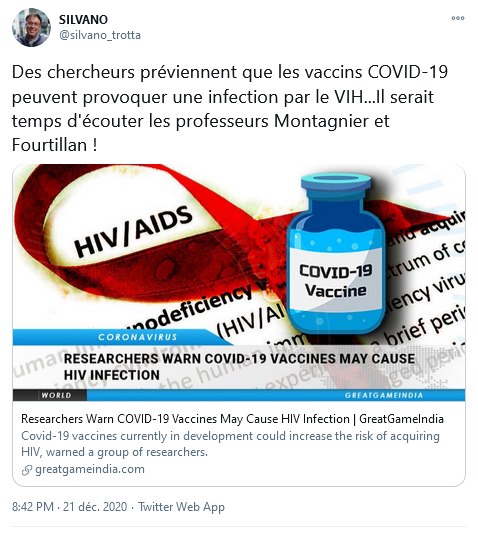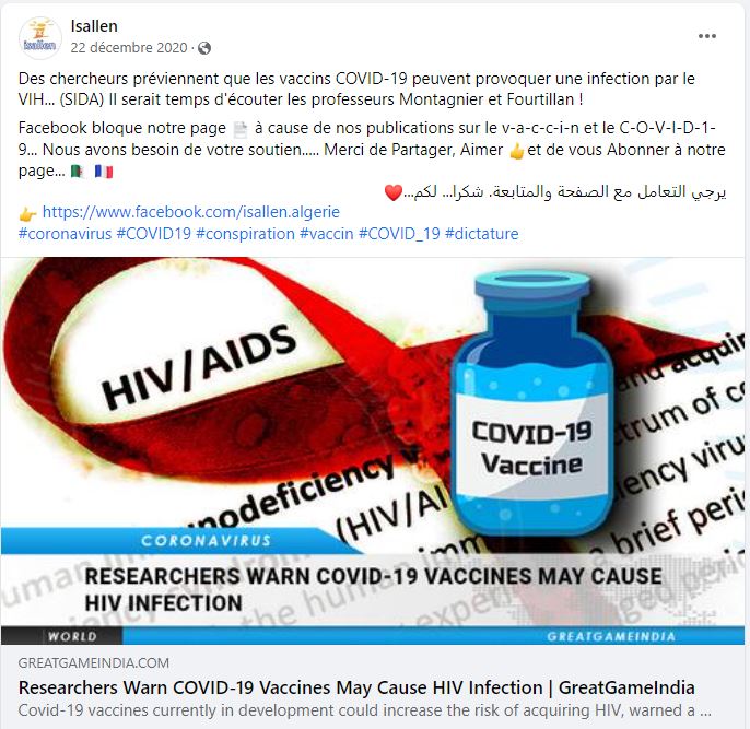 "Des chercheurs préviennent que les vaccins Covid-19 peuvent provoquer une infection par le VIH (SIDA)", avancent ces publications, qui circulent depuis le mois d'octobre 2020 sur Facebook (1, 2).