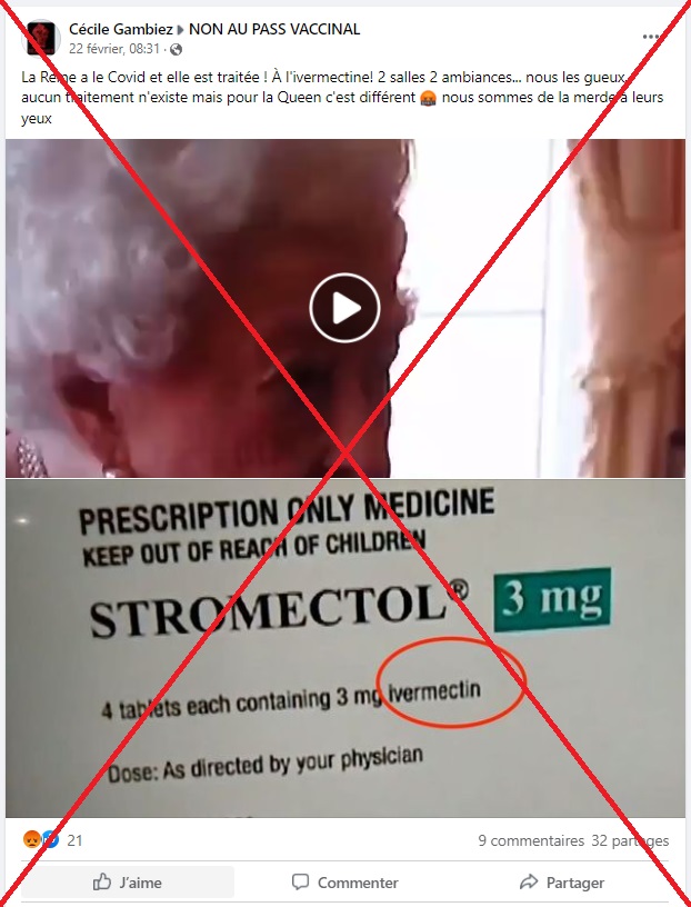 "La Reine a le Covid et elle est traitée ! À l'ivermectine! 2 salles 2 ambiances... nous les gueux, aucun traitement n'existe mais pour la Queen c'est différent", affirment des publications partagées plusieurs milliers de fois sur Facebook (1, 2) et sur Twitter (1, 2, 3). Des contenus similaires ont également circulé en anglais, en espagnol et en portugais.