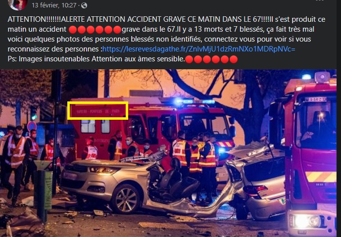 Cette publication Facebook décrivant un "horrible accident à Nantes" utilise ainsi une image que l'on peut retrouver dans La Voix du Nord sur un accident à Maubeuge en octobre 2021. Cet autre prétendu "horrible accident" survenu dans le 67 est quant à lui associé avec une photo illustrant un accident survenu à Aulnay-sous-Bois, en Île-de-France, parue dans le Parisien en avril 2021. On peut d'ailleurs repérer les mots "sapeurs-pompiers de Paris" sur le véhicule des secours apparaissant dans l'image.