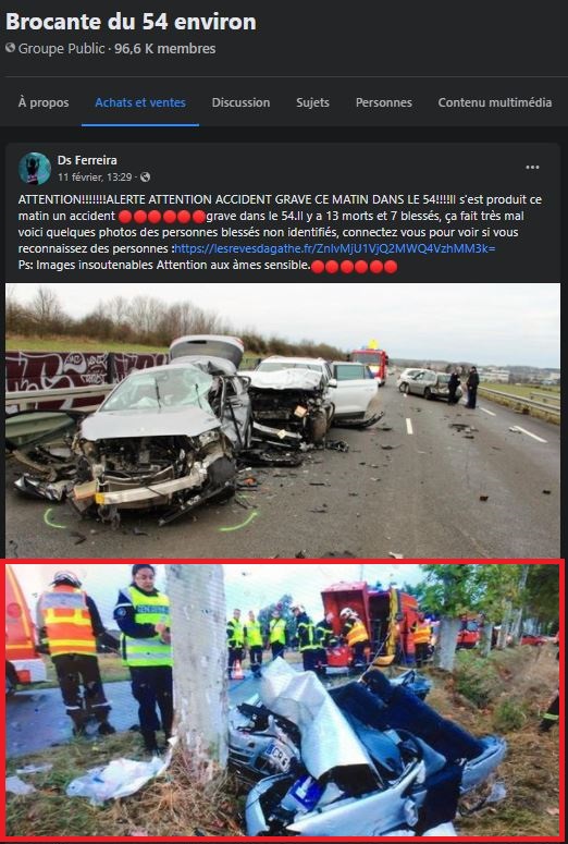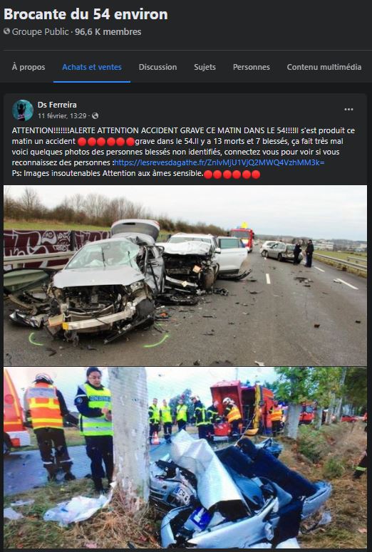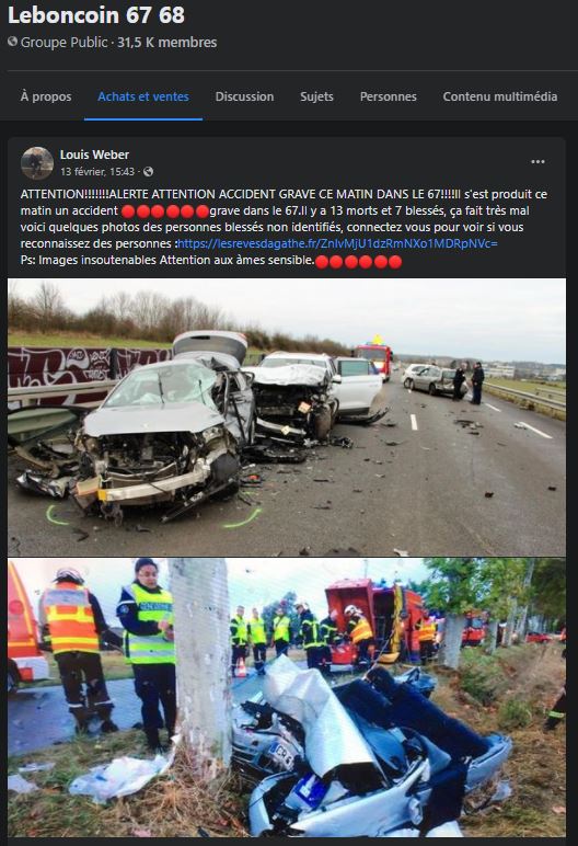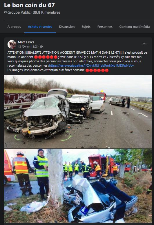 "ATTENTION!!!!!!! ALERTE ATTENTION ACCIDENT GRAVE CE MATIN DANS LE 67!!!!Il s'est produit ce matin un accident grave dans le 67.Il y a 13 morts et 7 blessés, ça fait très mal voici quelques photos des personnes blessés non identifiés, connectez vous pour voir si vous reconnaissez des personnes", prétend une publication assortie de photos, partagée le 3 mars sur le groupe Facebook aux 40.000 membres, "Le bon coin du 67".