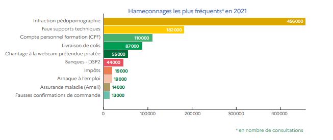 "L'hameçonnage, ou phishing en anglais, reste en 2021 la principale cybermalveillance rencontrée, tous publics confondus, en hausse de +143 % par rapport à l'année précédente (...) En 2021, 1,3 million de personnes sont venues chercher de l'information et de l'assistance sur Cybermalveillance.gouv.fr pour des faits apparentés à de l’hameçonnage, soit plus de 50 % du trafic global de la plateforme", note ce rapport.