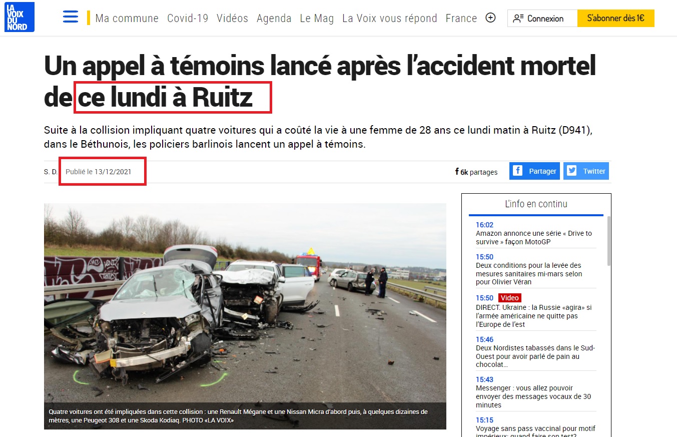 Par exemple, la première photo montrant prétendument un accident dans le "67" (le Bas-Rhin) ou le "54" (la Meurthe-et-Moselle) apparaissait en réalité déjà début décembre 2021 dans La Voix du Nord, pour illustrer un accident à Ruitz, dans le Pas-de-Calais.