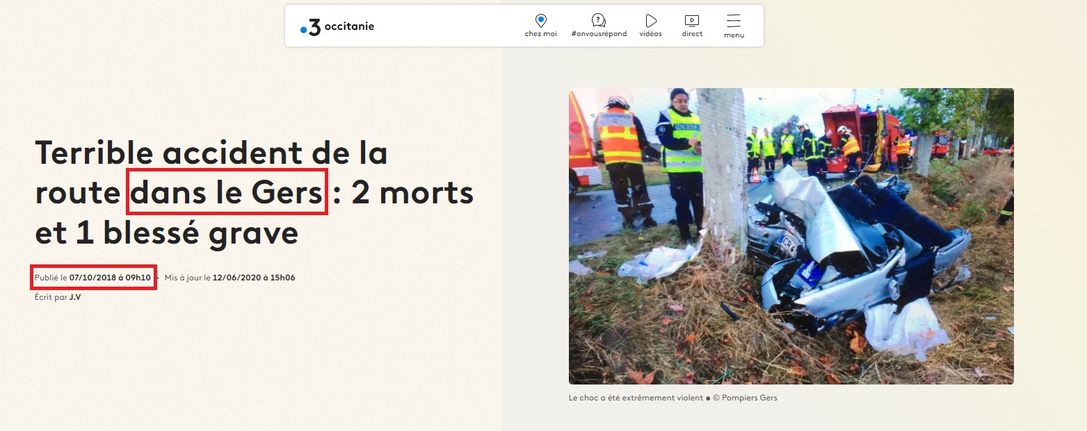 La deuxième photo apparaissant dans les posts Facebook avait quant à elle été utilisée dans un article de France 3 Occitanie pour illustrer un accident de la route survenu en juillet 2018 dans le Gers.