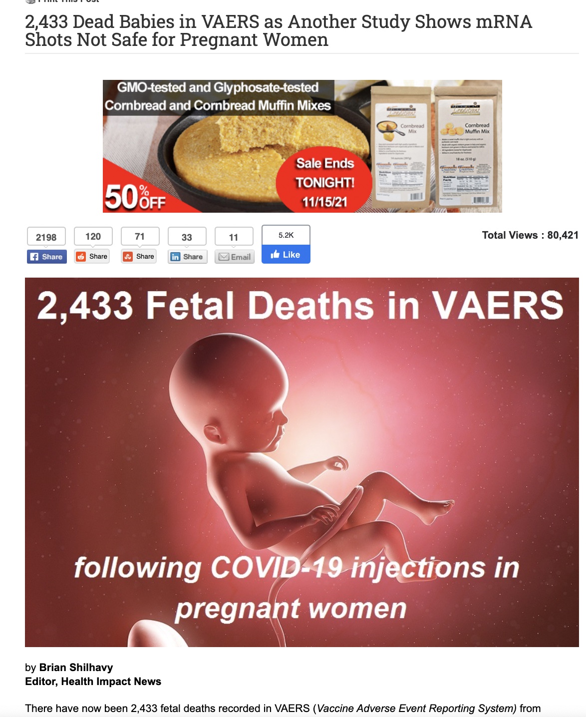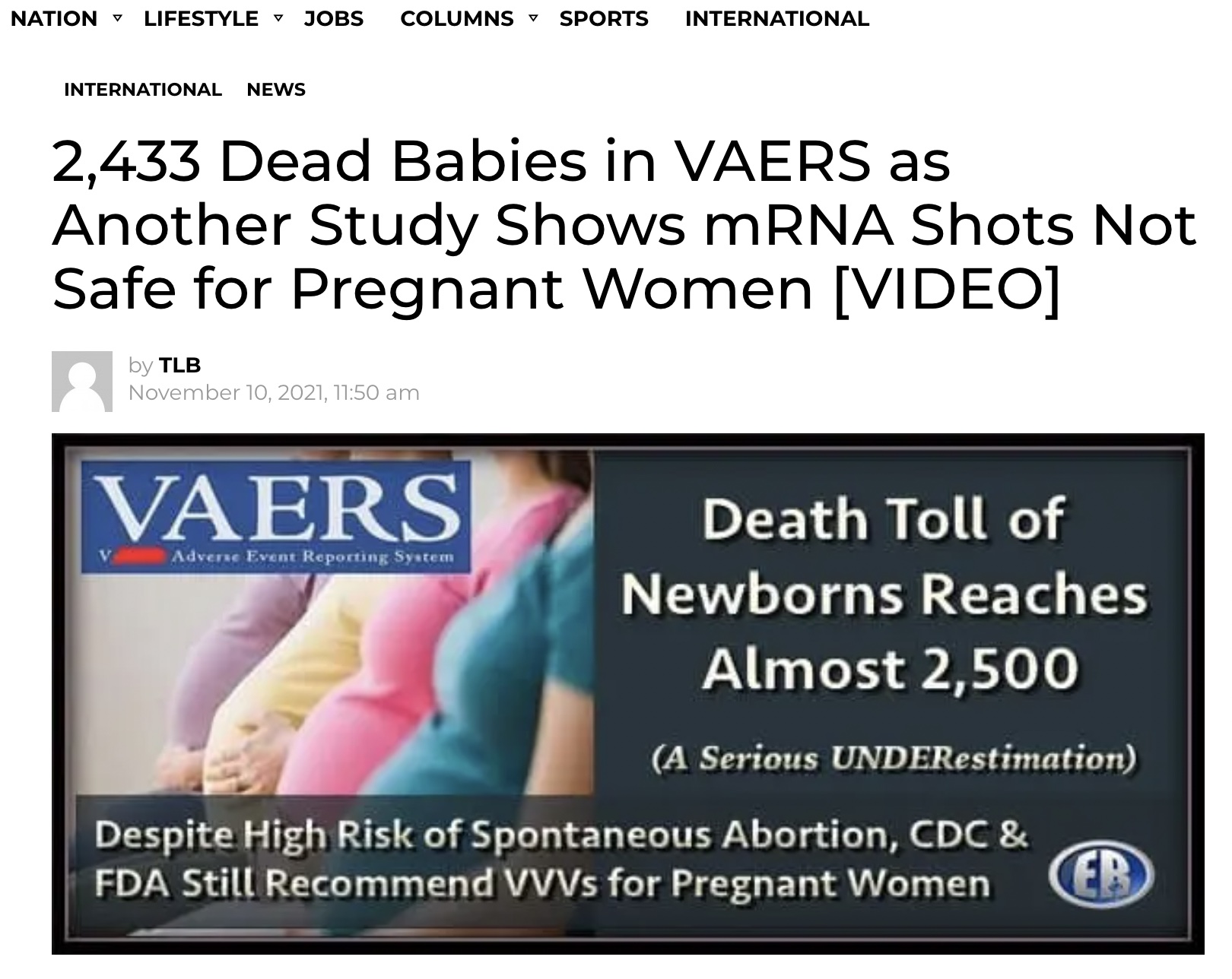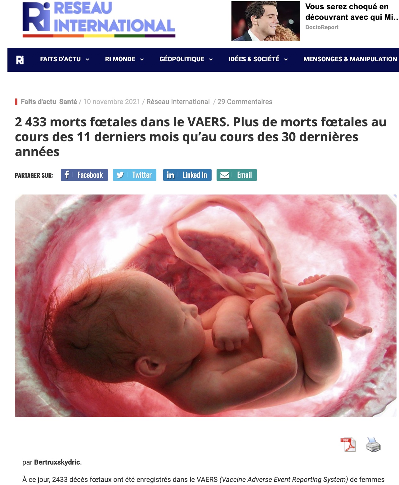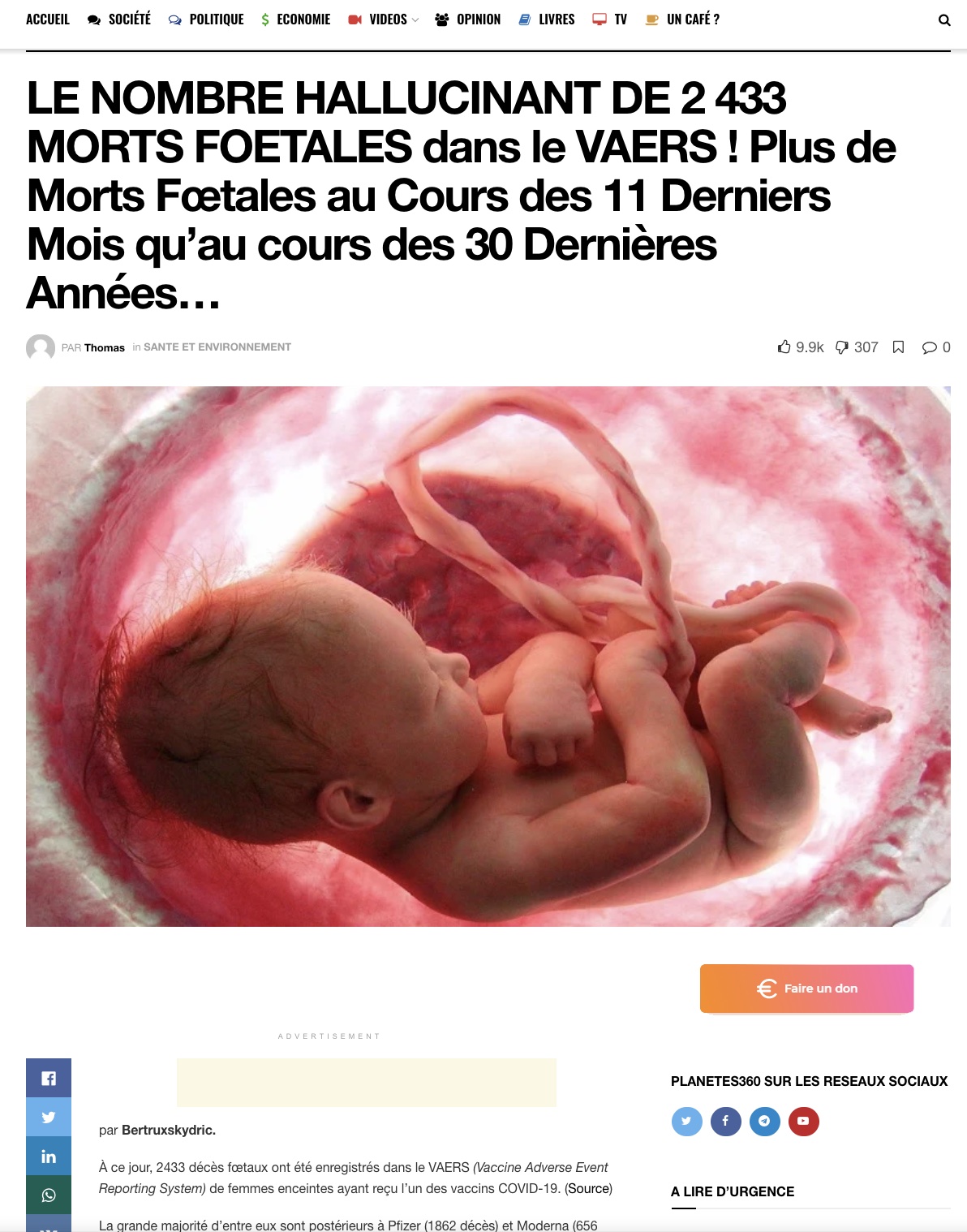 "À ce jour, 2.433 décès fœtaux ont été enregistrés dans le VAERS (Vaccine Adverse Event Reporting System) de femmes enceintes ayant reçu l'un des vaccins Covid-19 (...) Il y a eu plus de morts fœtales au cours des 11 derniers mois à cause des vaccins Covid-19 qu'il n'y en a eu au cours des 30 dernières années à cause de TOUS les vaccins", indique cet article, repris le 10 novembre par les sites Planète360, Réseau international et Resistance-mondiale, déjà épinglés à plusieurs reprises par l'AFP pour désinformation (1, 2, 3).