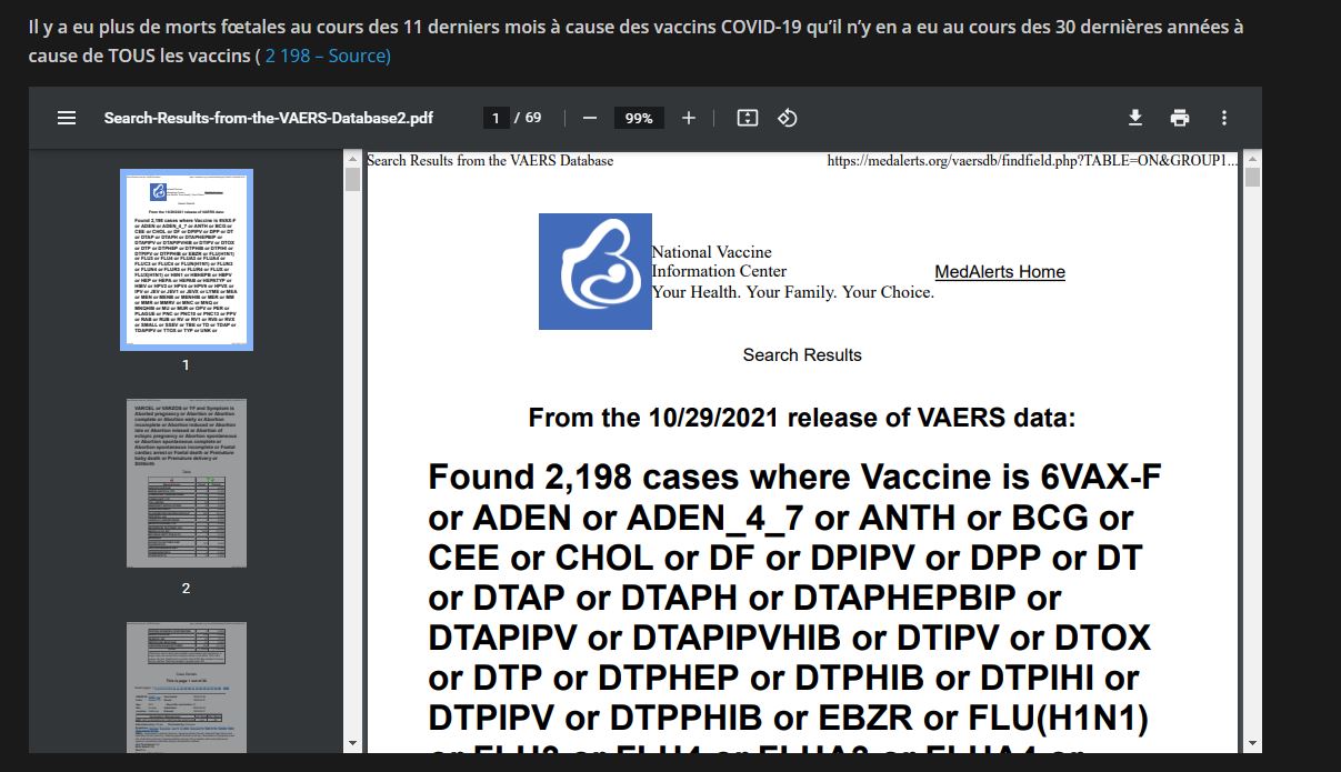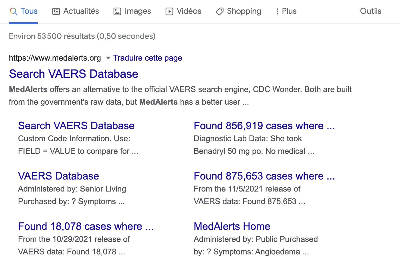 Les articles viraux citent comme source MedAlerts.org, un site du National Vaccine Information Center, qui se présente comme un outil "alternatif" servant à "effectuer des recherches dans la base de données du VAERS".