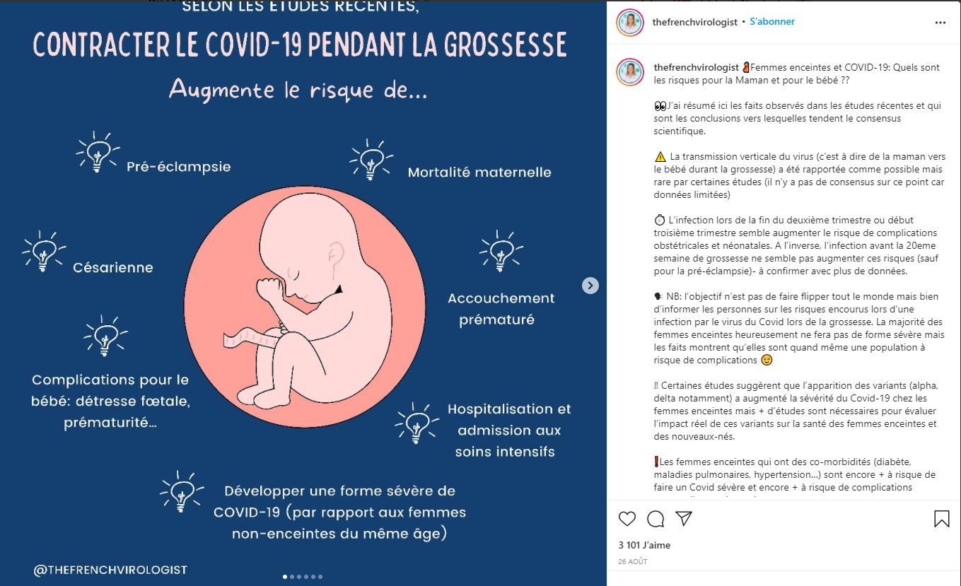 Le Dr Océane Sorel, spécialiste en virologie et en immunologie et membre de la "Team Halo" des Nations Unies, qui regroupe des scientifiques engagés dans la lutte contre la désinformation sur les réseaux sociaux, rappelle sur son compte Instagram que " les études ont montré que les femmes enceintes étaient plus à risque de développer une forme sévère de Covid et d'être hospitalisées que les femmes non-enceintes du même âge".