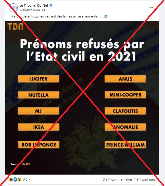 Ces publications sont toutefois fondées sur une infox : l'Insee, qui publie chaque année un classement des prénoms les plus usités, a fait savoir le 21 février à l'AFP qu'il ne répertorie en aucune façon ceux retoqués par l'état civil, qui ne font par l'ailleurs l'objet d'aucun recensement officiel.