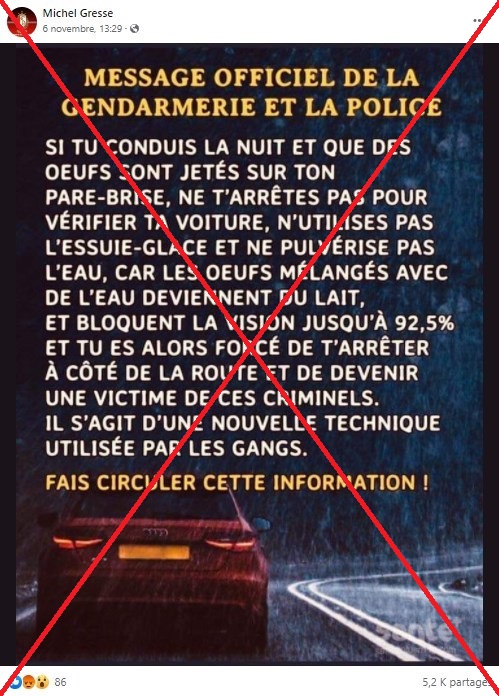 Il s'agit, selon cette publication relayée plus de 5 000 fois depuis le 6 novembre 2021, d'un "message officiel de la gendarmerie et de la police". "Si tu conduis la nuit et que des œufs sont jetés sur ton pare-brise, ne t'arrêtes pas pour vérifier ta voiture, n'utilises pas l'essuie-glace et ne pulvérise pas l'eau", conseille l'auteur du texte, "car les œufs mélangés avec de l'eau deviennent du du lait et bloquent la vision jusqu'à 92,5% et tu es alors forcé de t'arrêter à côté de la route et de devenir une victime de ces criminels".