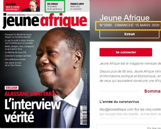 Mais plusieurs éléments permettent de voir assez rapidement que cette Une de Jeune Afrique est en réalité un montage. Sur la bannière en haut de la couverture, le nom du président de la République démocratique du Congo (RDC) est mal orthographié: on lit "Tshisededi" au lieu de Tshisekedi. De plus, la date de cette édition est grossièrement écrite: elle mentionne "n°3088 du 15 au 10 mars 2022".